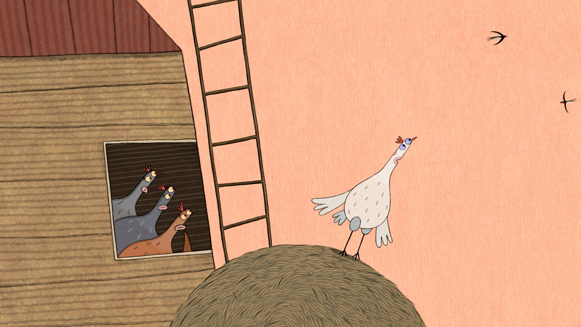 The hen is supposed to lay eggs, just like the other chickens. But the swallows in the air have awakened a completely different longing in her: she wants to fly!